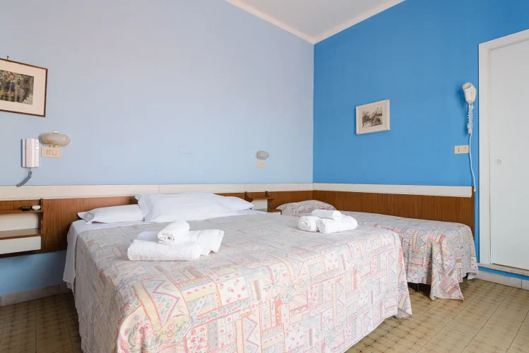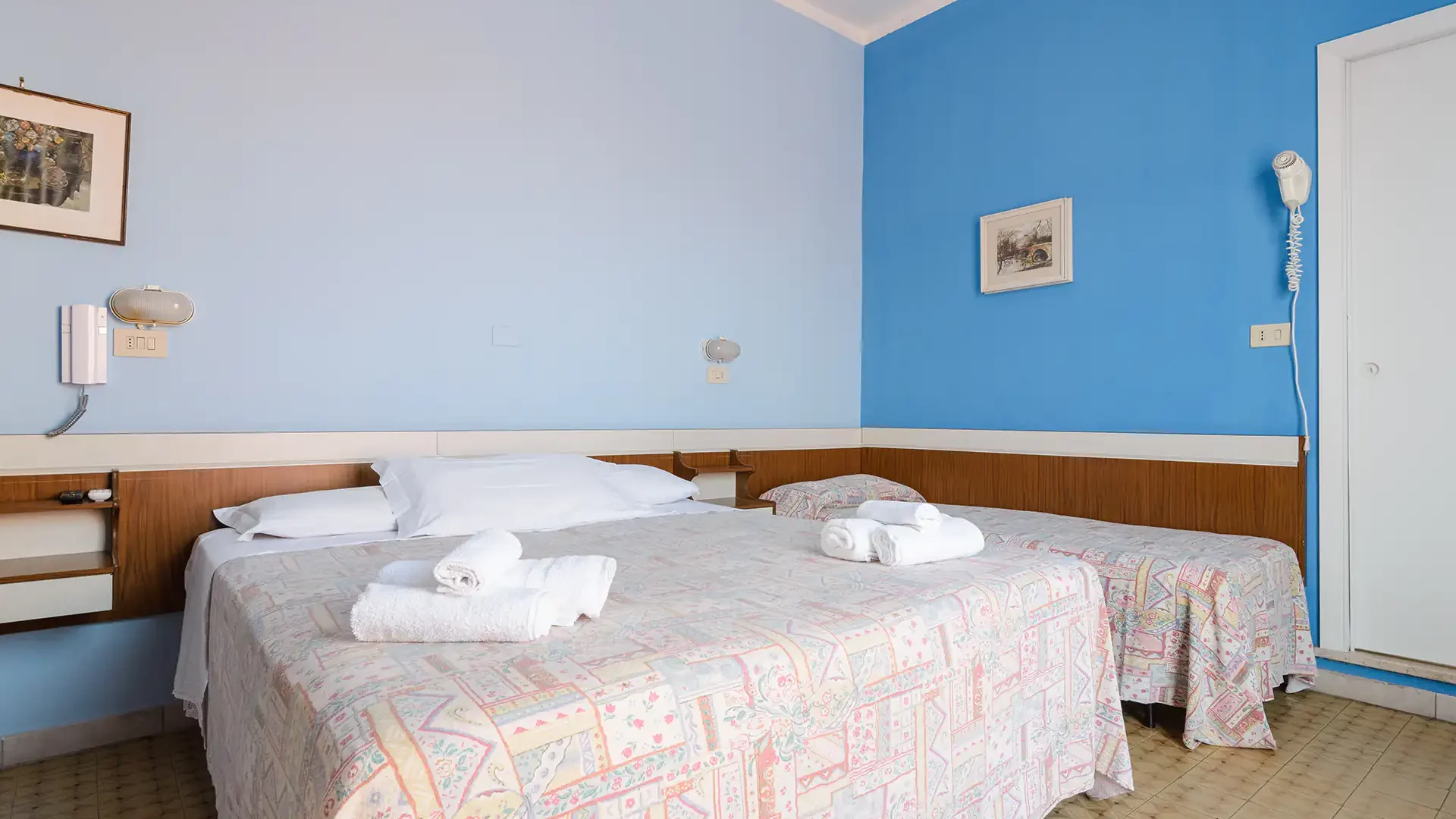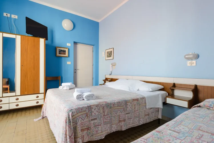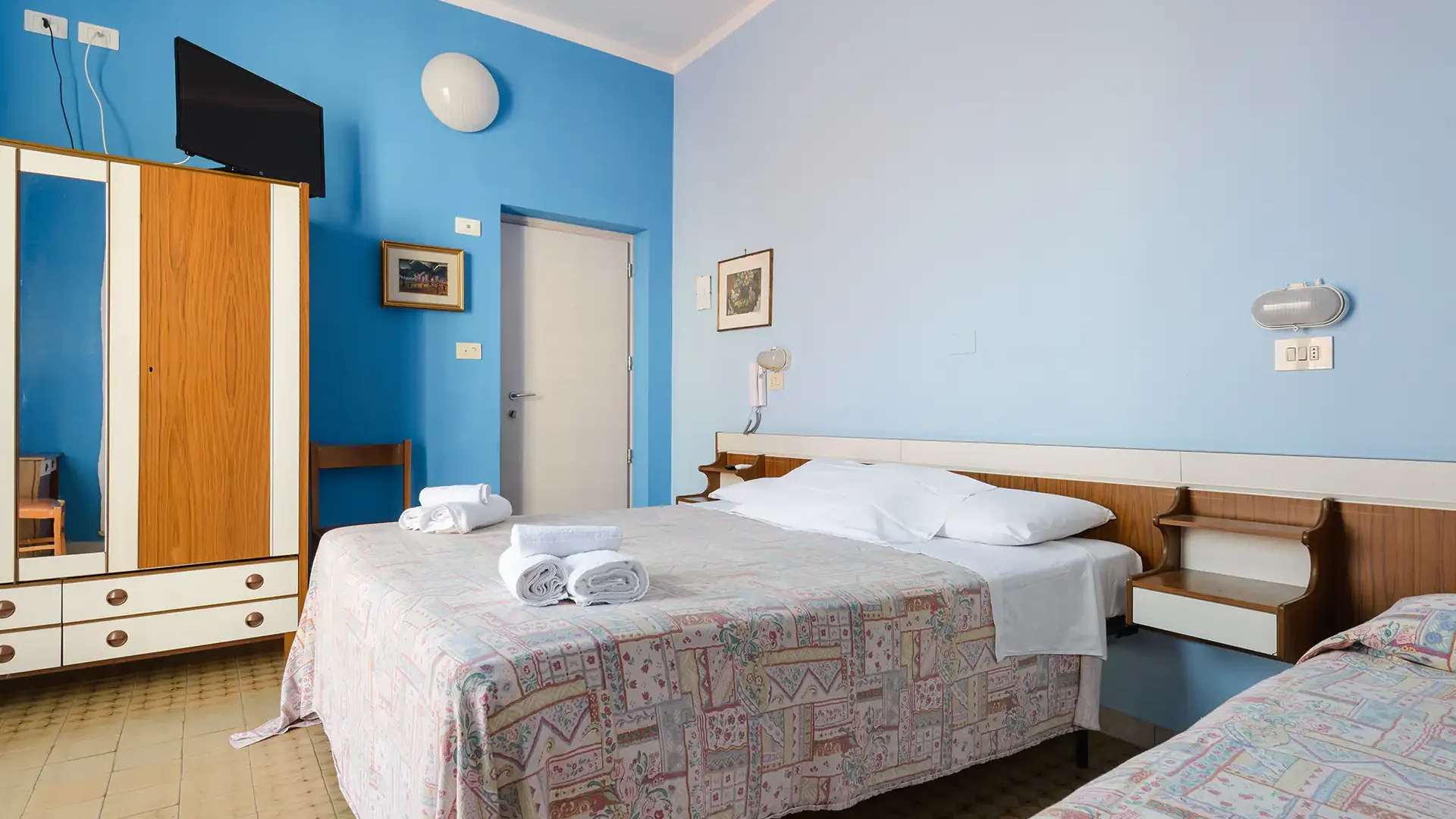 Naviga:HomeCamere Camera Standard Nelle nostre camere Standard, ampie e accoglienti, abbiamo curato ogni dettaglio per garantirti un riposo di qualità. Per le famiglie in viaggio, offriamo camere con lettini o culle, comode spondine anticaduta e tutto ciò che serve per farli dormire tranquilli accanto a te.Ed inoltre mettiamo a disposizione anche uno stendino in camera: ideale per costumi, teli mare e piccoli indumenti dopo una giornata di sole. In più, ogni giorno è previsto il cambio degli asciugamani e ogni tre giorni il cambio delle lenzuola. Perché una vacanza senza pensieri inizia proprio da qui! Dotazioni Aria condizionata Asciugacapelli Box doccia Cassaforte Riscaldamento autonomo Set di cortesia Televisore